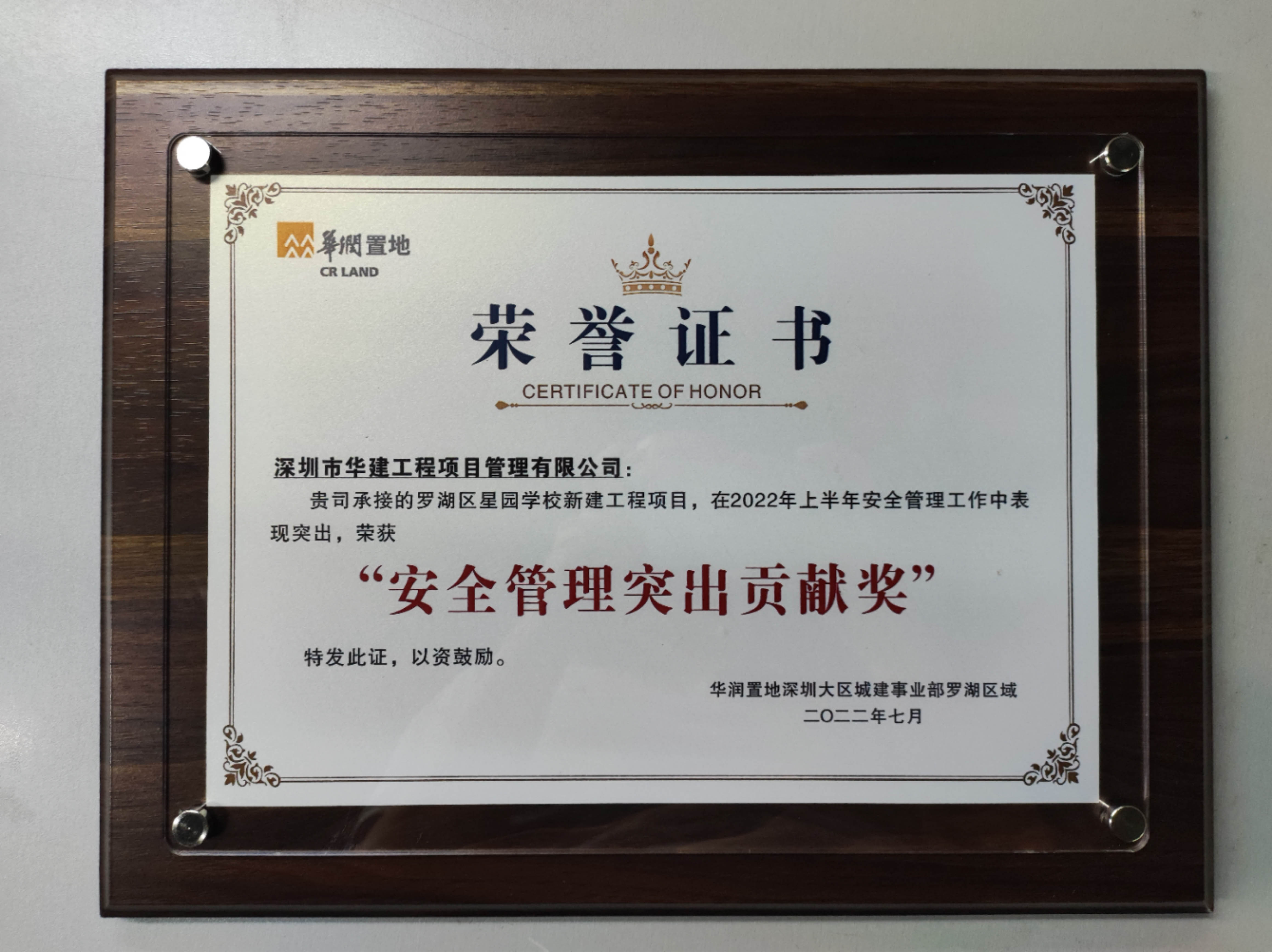 2022年9月,華建監理承建的羅湖區星園學校新建工程項目,因在安全管理工作中表現突出,被授予“安全管理突出貢獻獎”。