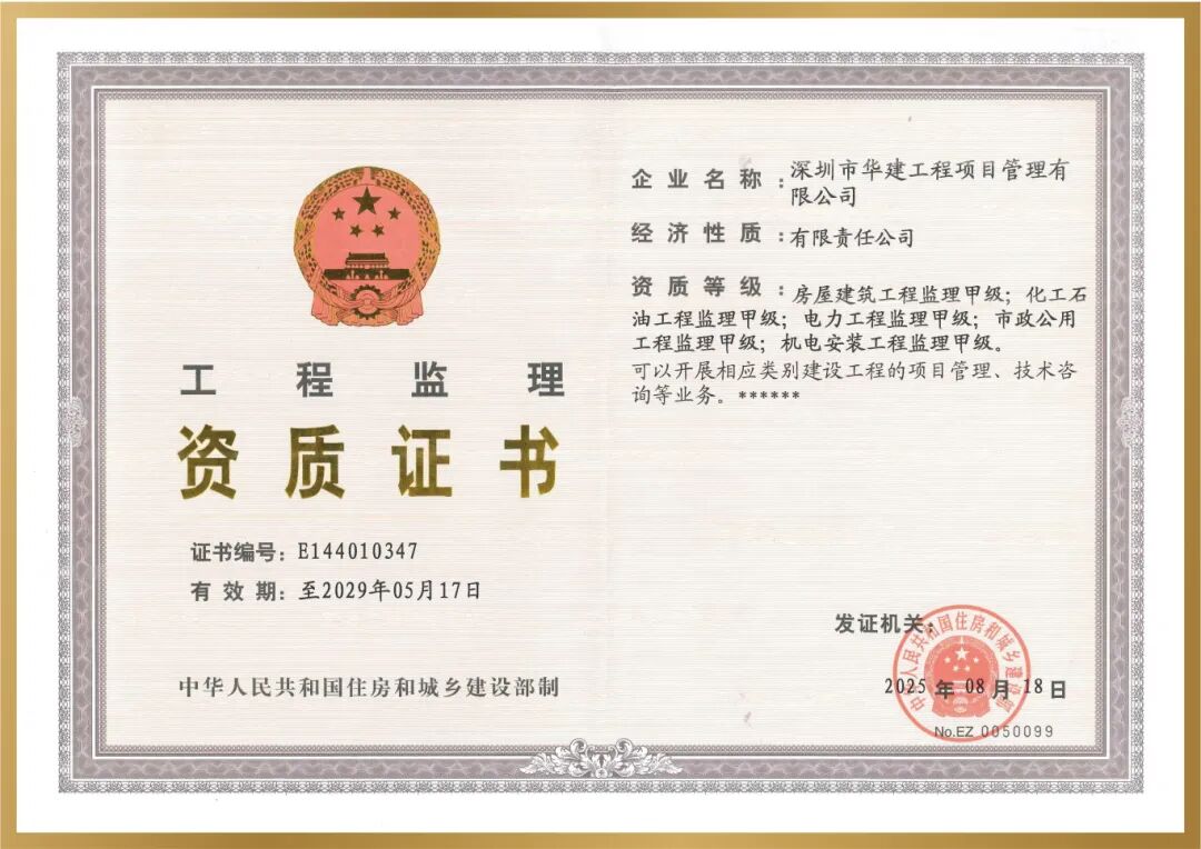 ▲華建監理成功取得房屋建筑、市政公用、電力、化工石油、機電安裝工程五大領域監理甲級資質,實現全專業高等級資質覆蓋,為承接各專項工程提供全面合規保障