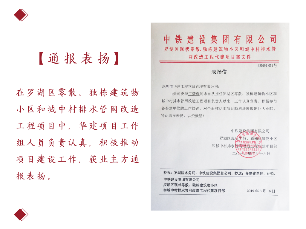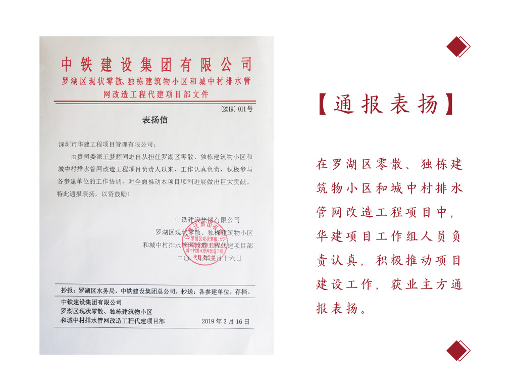 在羅湖區零散、獨棟建筑物小區和城中村排水管網改造工程項目中,華建工作組成員獲通報表揚